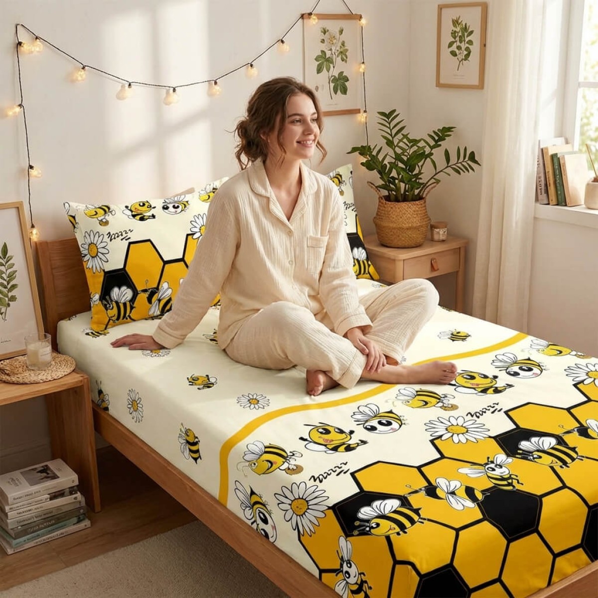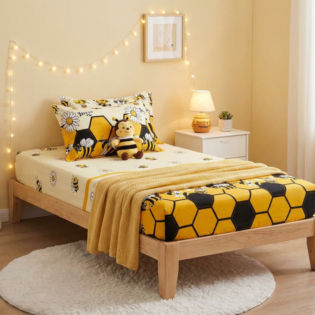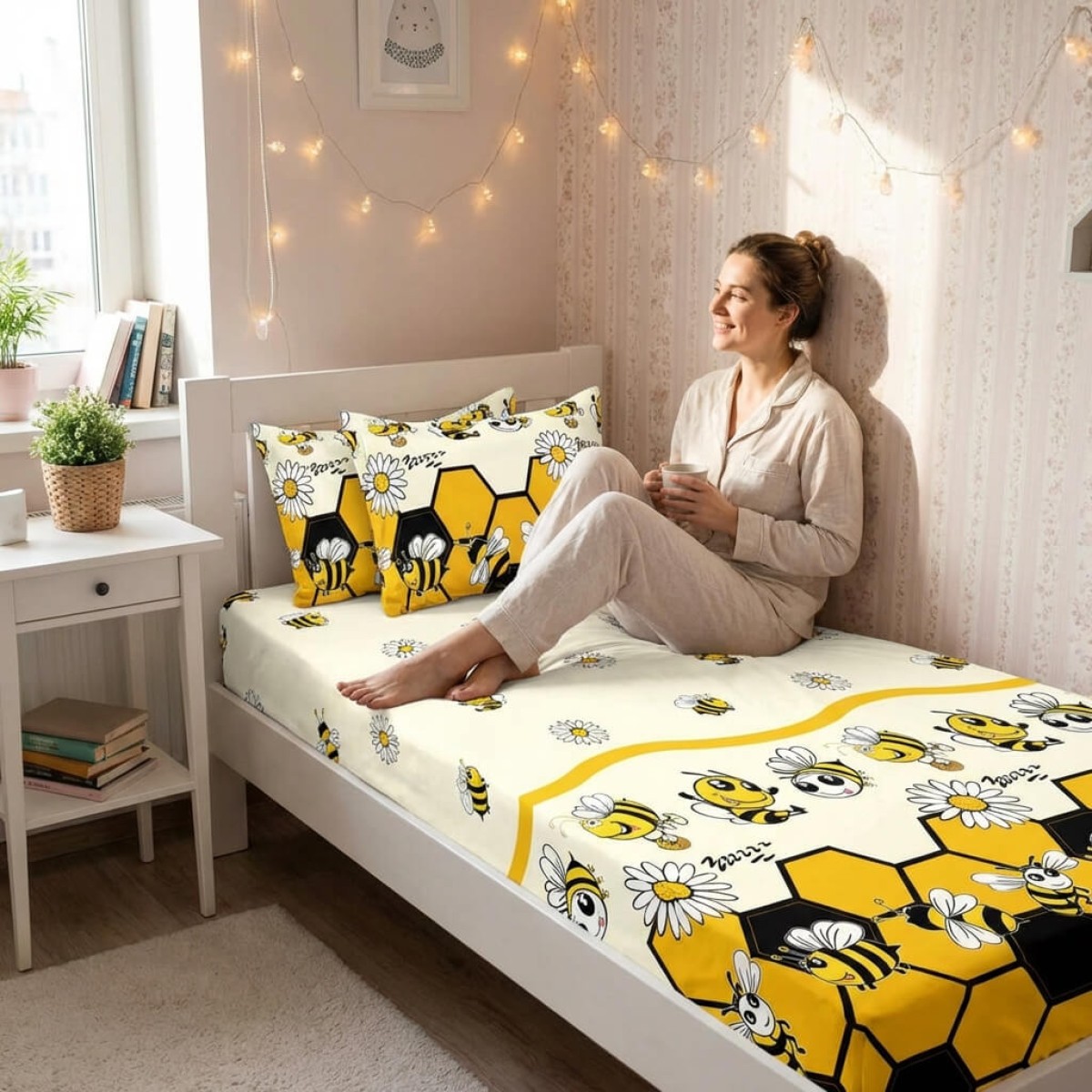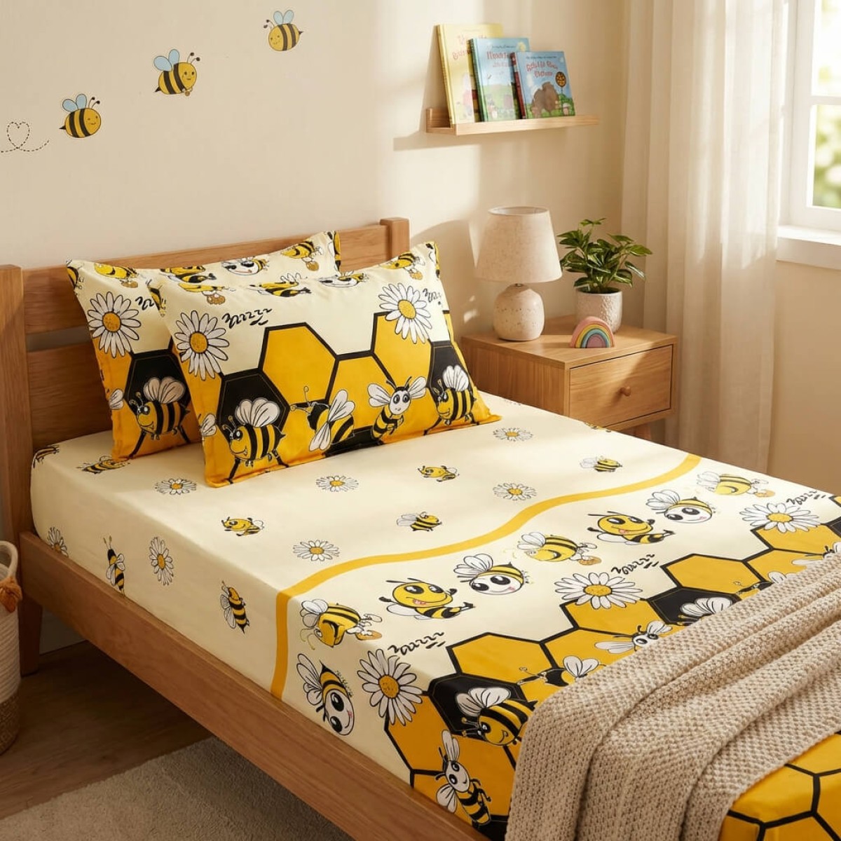 Единичен комплект чаршафи с ластик от 3 части, Пчелички