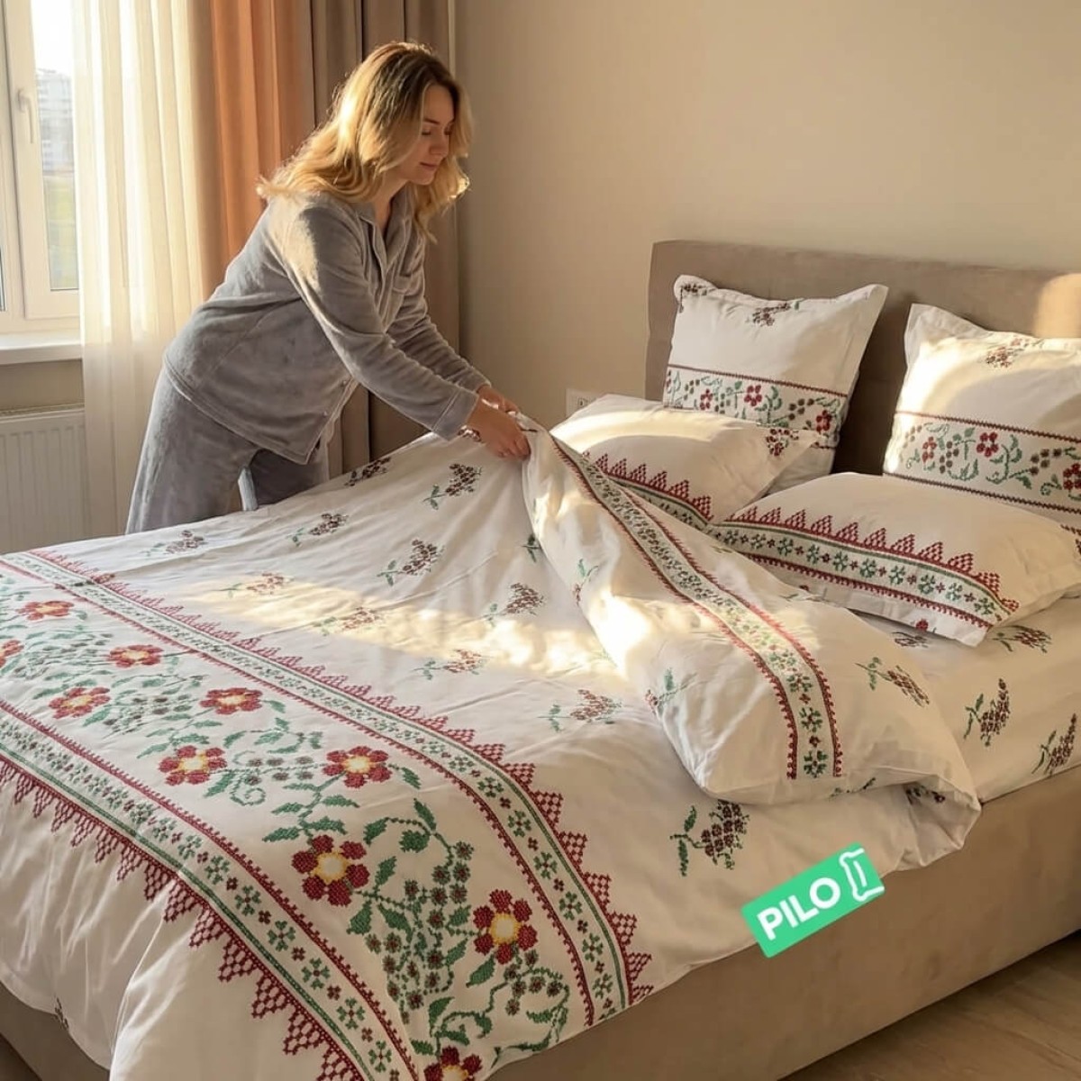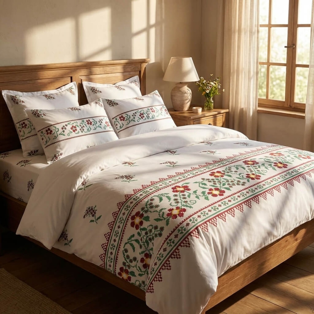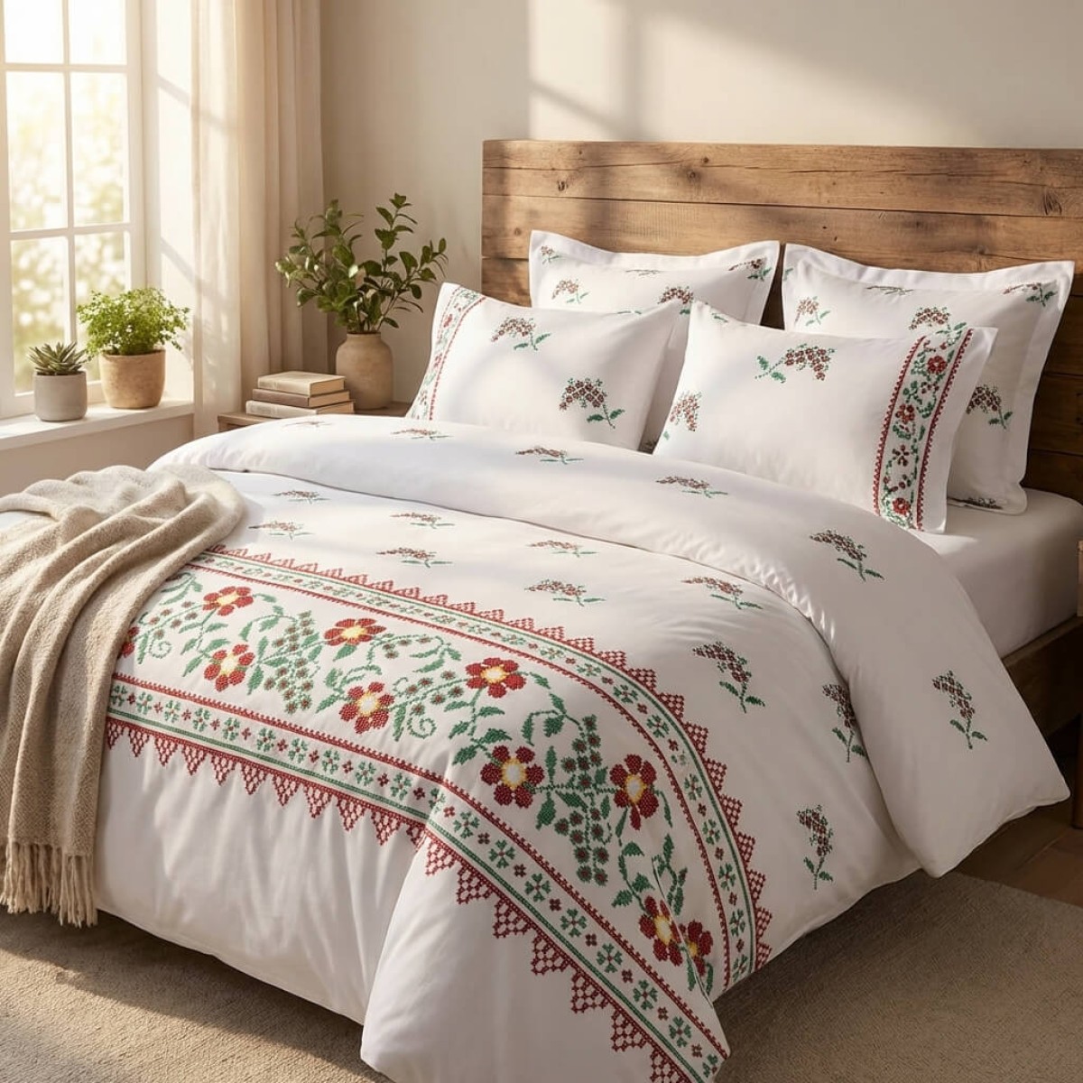 Комплектът чаршафи е с изящен дизайн, украсен с традиционни шевици, изобразяващи роза, които наподобяват бродирани фолклорни мотиви. Този комплект добавя уникален чар и топлина на всяка спалня, съчетавайки красотата на българските традиции с модерен комфорт. Висококачествената материя осигурява мекота и дълготрайност, докато елегантните мотиви създават усещане за автентичност и уют. Идеален избор за тези, които ценят народното изкуство и желаят да внесат част от него в своя дом.