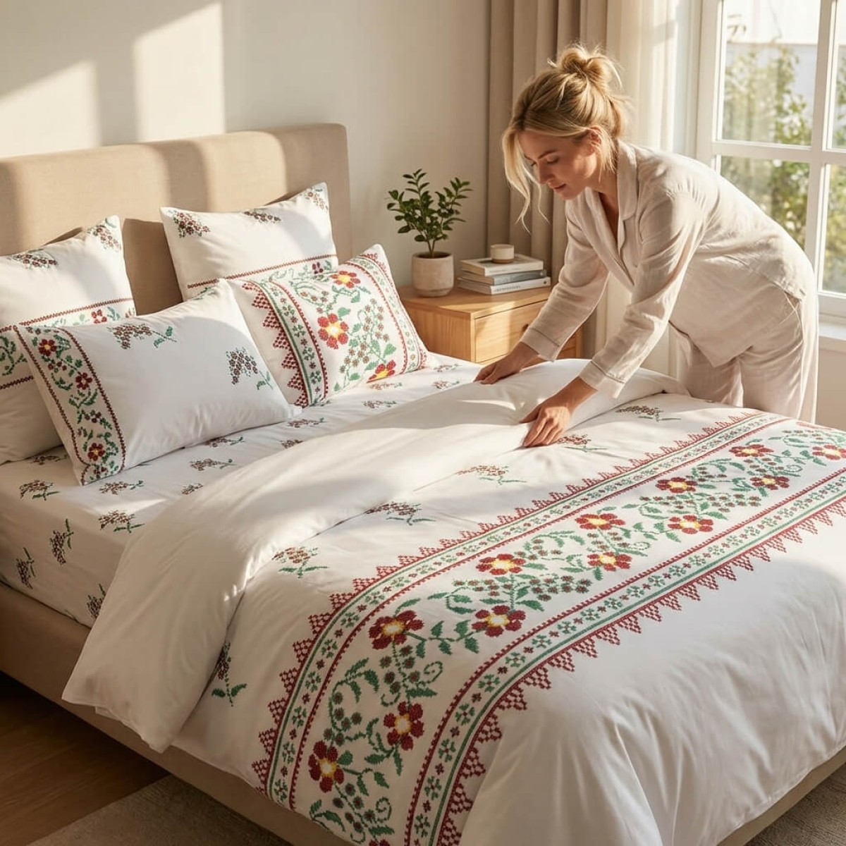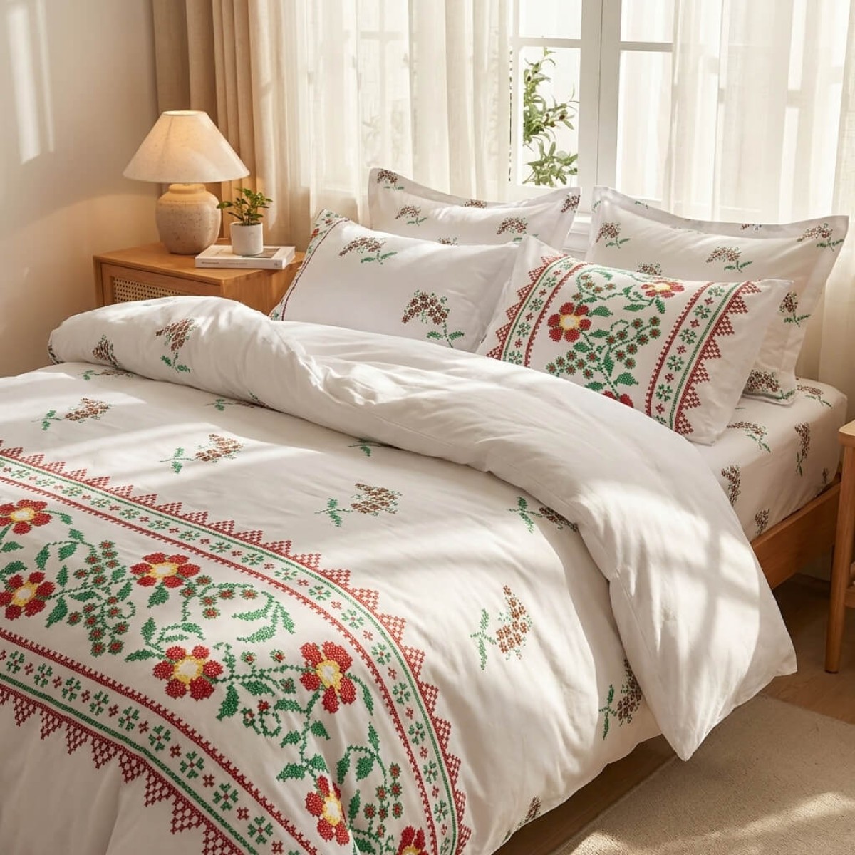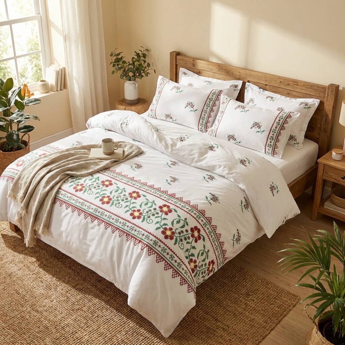 Комплектът чаршафи е с изящен дизайн, украсен с традиционни шевици, изобразяващи роза, които наподобяват бродирани фолклорни мотиви. Този комплект добавя уникален чар и топлина на всяка спалня, съчетавайки красотата на българските традиции с модерен комфорт. Висококачествената материя осигурява мекота и дълготрайност, докато елегантните мотиви създават усещане за автентичност и уют. Идеален избор за тези, които ценят народното изкуство и желаят да внесат част от него в своя дом.