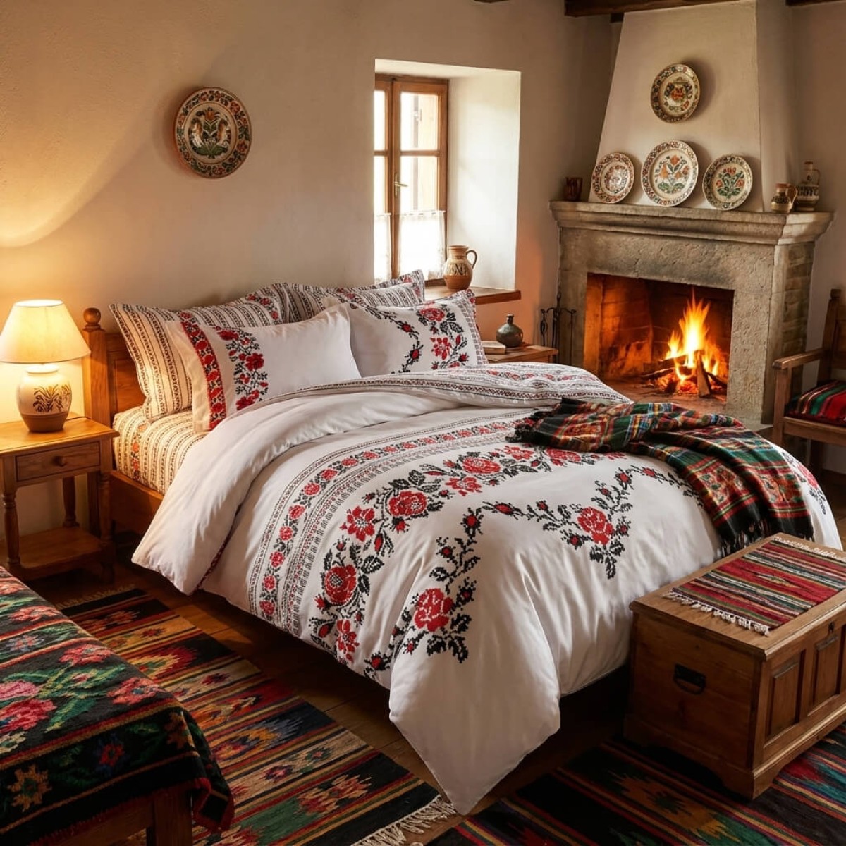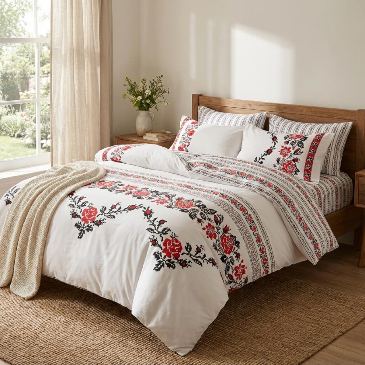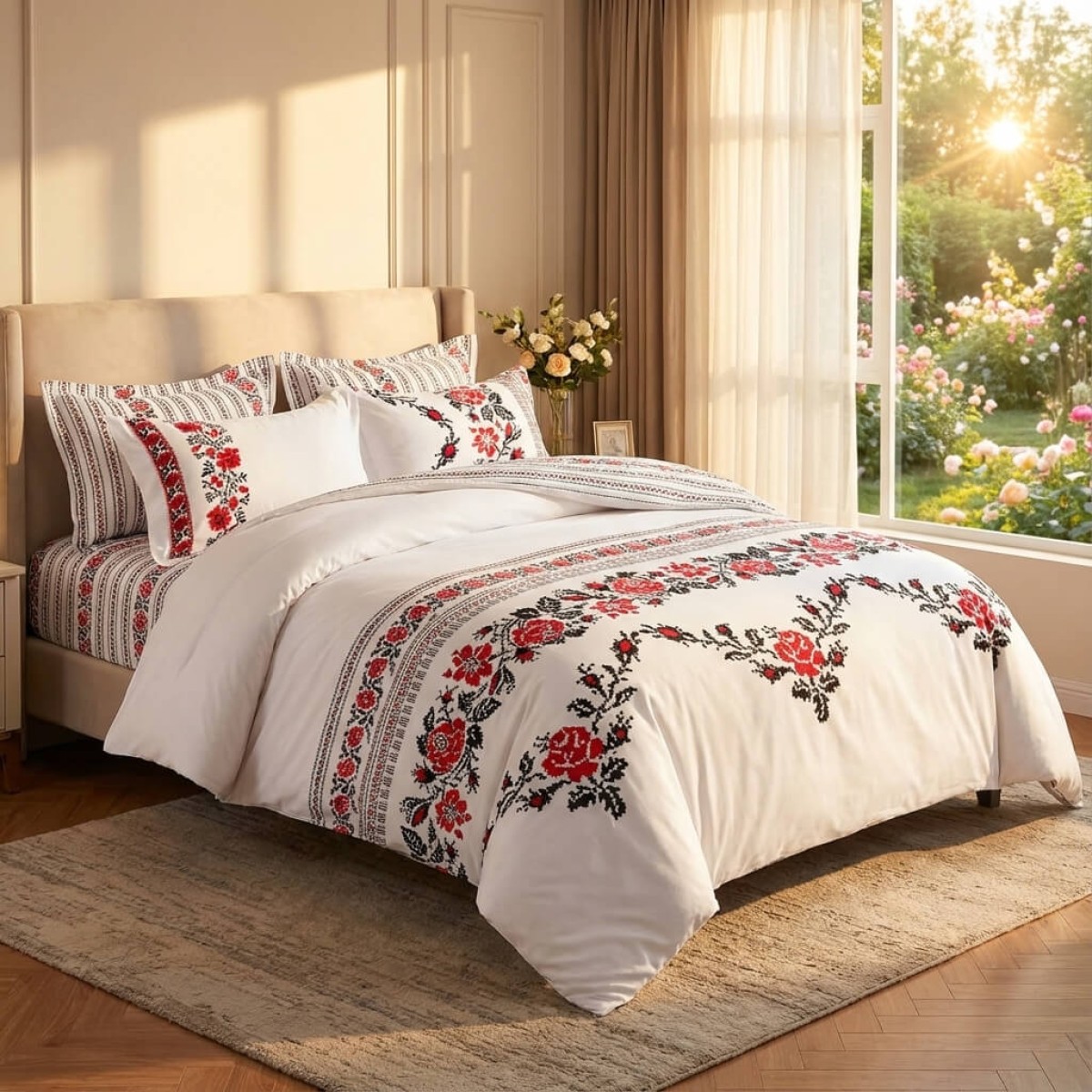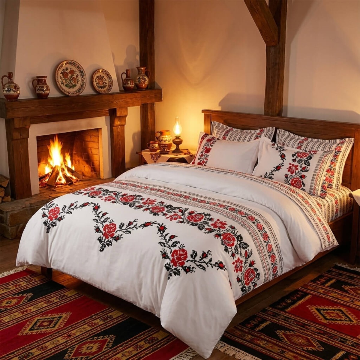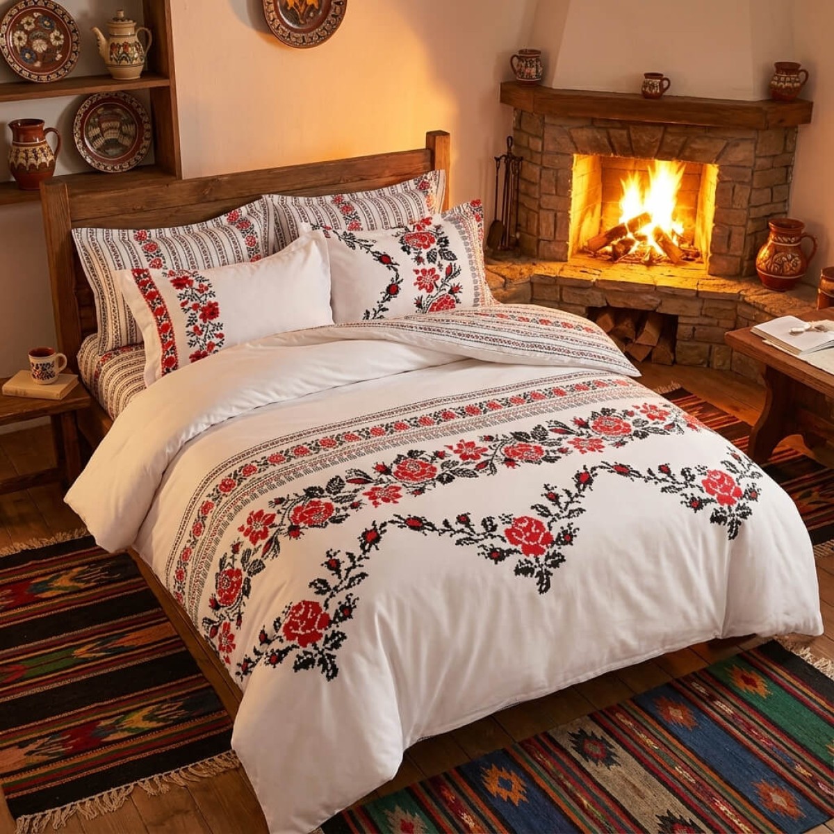 Комплектът чаршафи е с изящен дизайн, украсен с традиционни шевици, изобразяващи роза, които наподобяват бродирани фолклорни мотиви. Този комплект добавя уникален чар и топлина на всяка спалня, съчетавайки красотата на българските традиции с модерен комфорт. Висококачествената материя осигурява мекота и дълготрайност, докато елегантните мотиви създават усещане за автентичност и уют. Идеален избор за тези, които ценят народното изкуство и желаят да внесат част от него в своя дом.