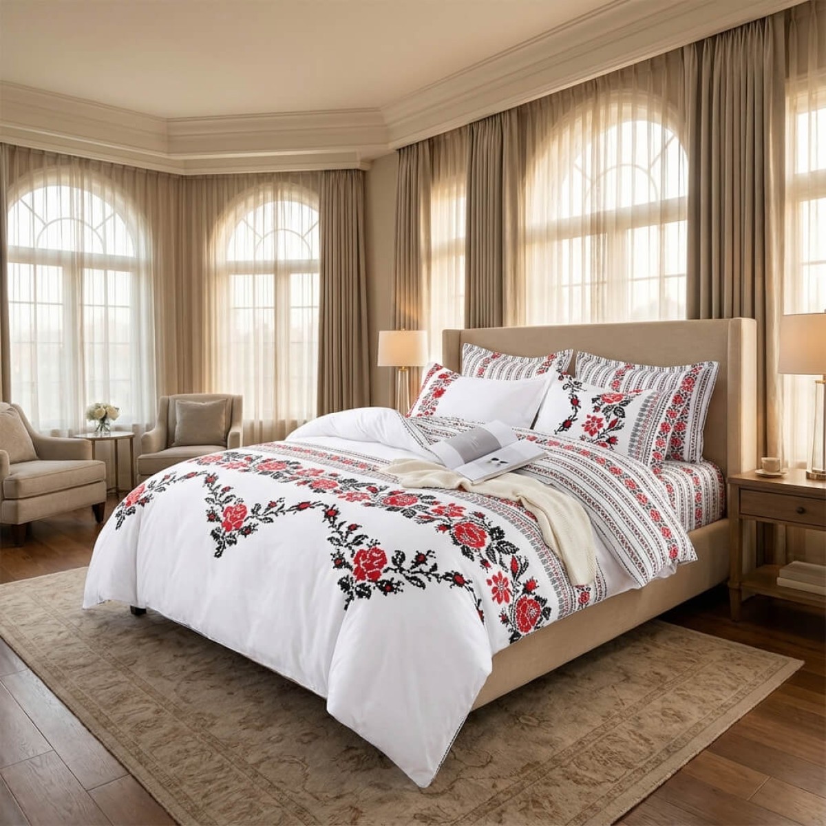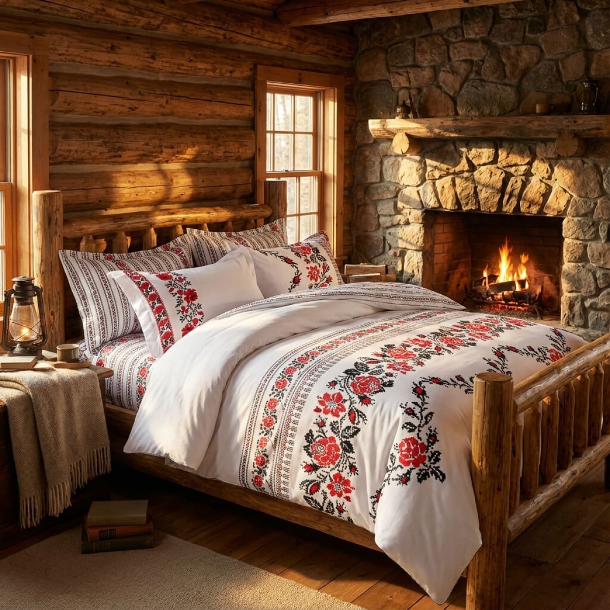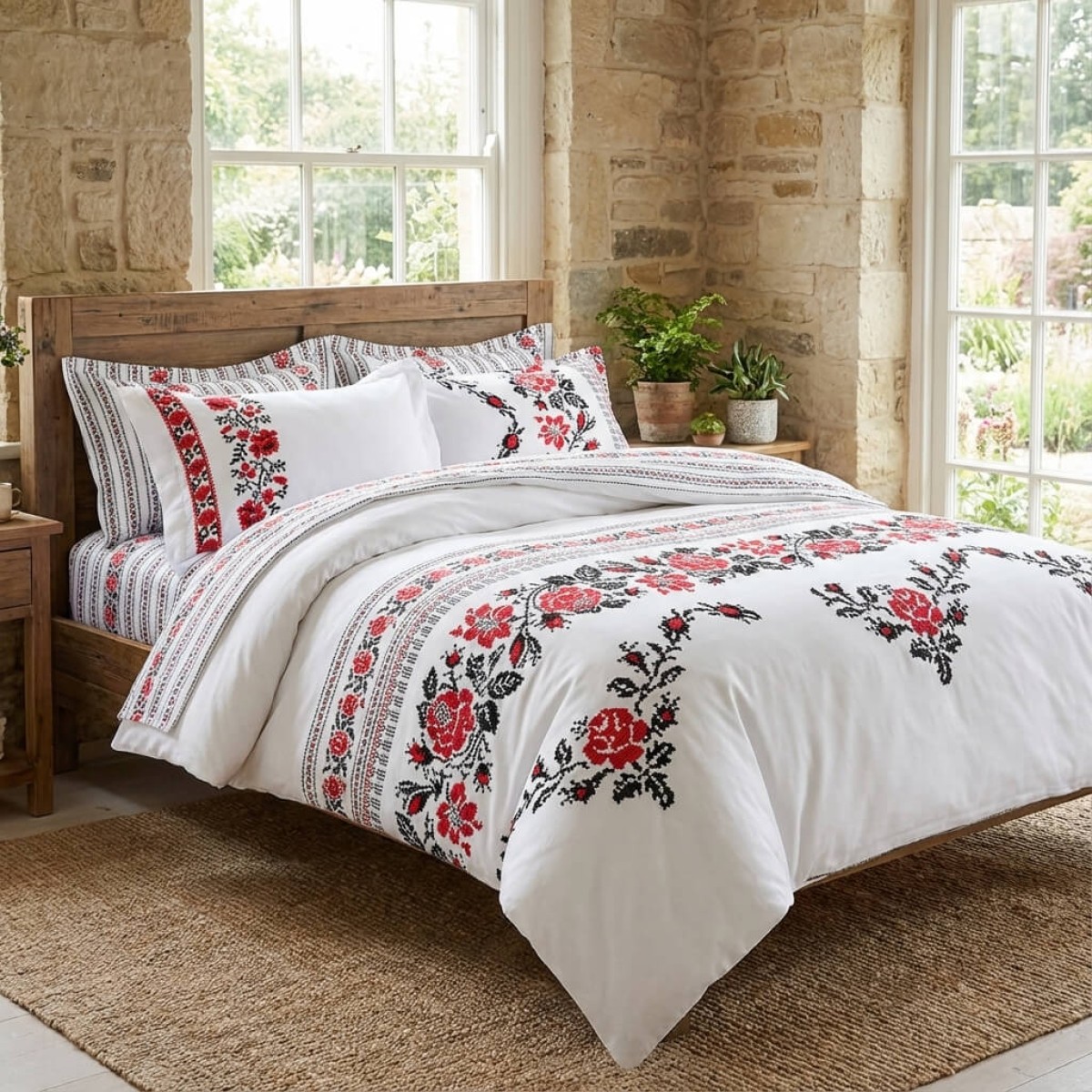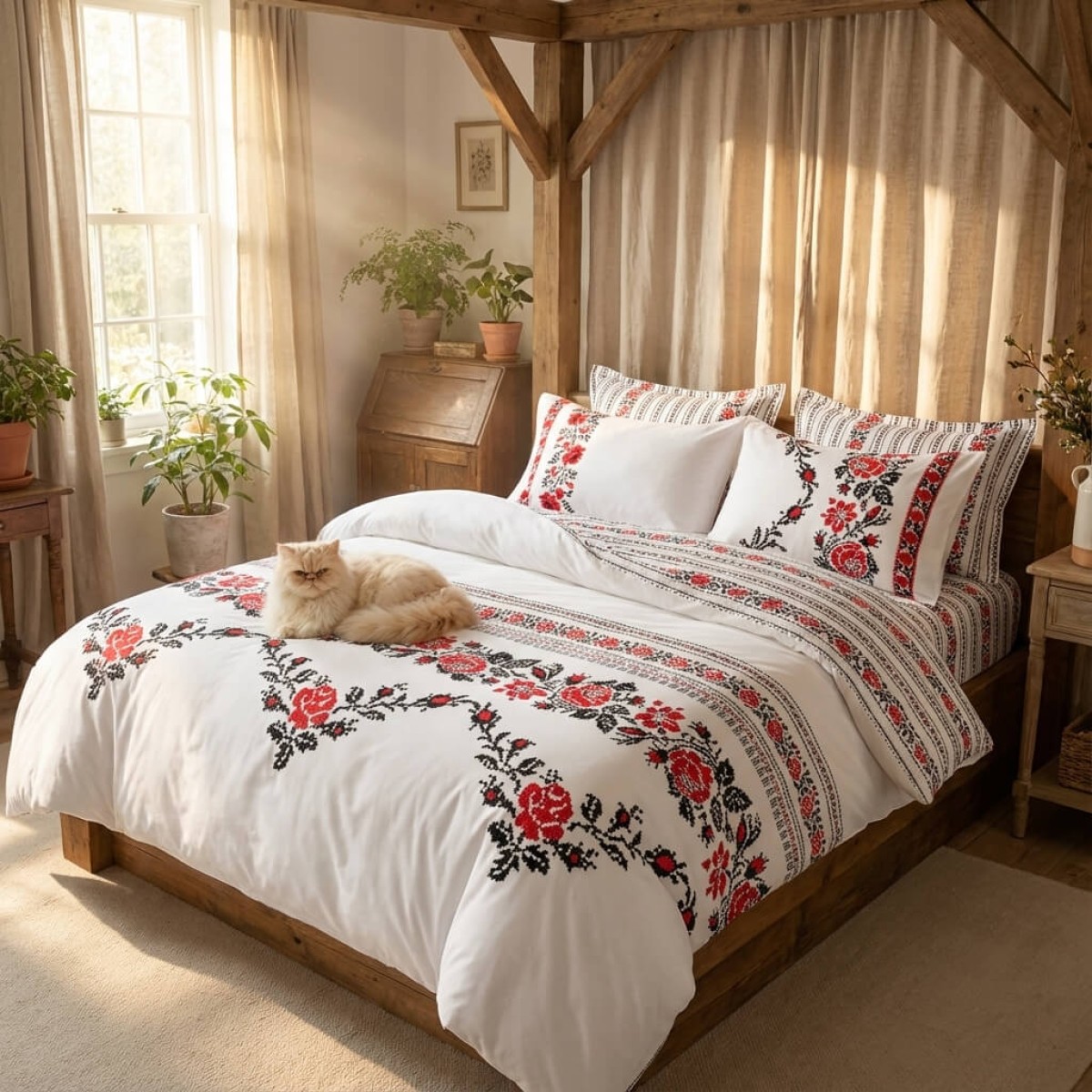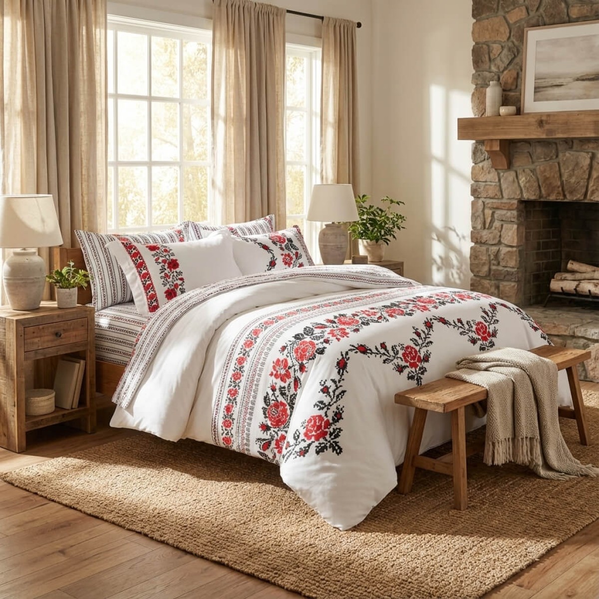 Комплектът чаршафи е с изящен дизайн, украсен с традиционни шевици, изобразяващи роза, които наподобяват бродирани фолклорни мотиви. Този комплект добавя уникален чар и топлина на всяка спалня, съчетавайки красотата на българските традиции с модерен комфорт. Висококачествената материя осигурява мекота и дълготрайност, докато елегантните мотиви създават усещане за автентичност и уют. Идеален избор за тези, които ценят народното изкуство и желаят да внесат част от него в своя дом.